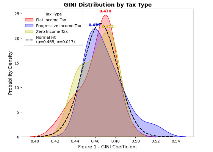 A comparison of the distribution of inequality (GINI Coefficients) in Figure 1 below shows that the distribution of scores in all three groups of tax structures is similar and are approximately normally distributed (black-dashed line). There was no evidence of a difference in the means of inequality scores in the three groups (Test 1, One-way ANOVA Test F=0.9087 P-value: 0.4100)