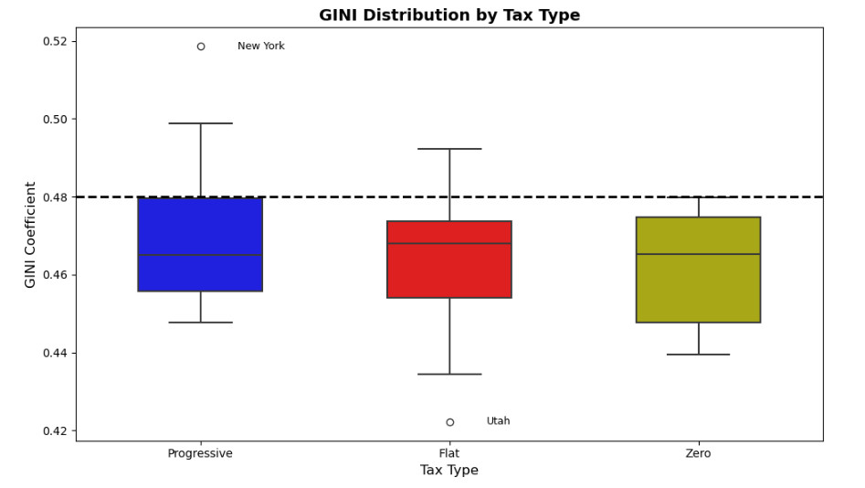 Figure 2 below is a secondary comparison using a Box and Whisker Plot with a line drawn at GINI = 0.48 to visualize where states with higher-than-average inequality are distributed. The medians of inequality in each group are also similar; however, there are more high-inequality (GINI >= 0.48) states in Progressive Tax States, in number, proportion, and depth of inequality. A one-tailed Z-test of the proportion of high-inequality states in Progressive Tax States (PProgressive= 27.78%) versus proportion of high-inequality states in Non-Progressive Tax States (PNonProgressive =6.25%) (Test 2) yielded a result of Z=-2.1058 (P-value: 0.0176) indicating there IS evidence of a higher proportion of high-inequality states in Progressive Tax States compared to Non-Progressive Tax States with New York being the highest inequality in the country as discussed in