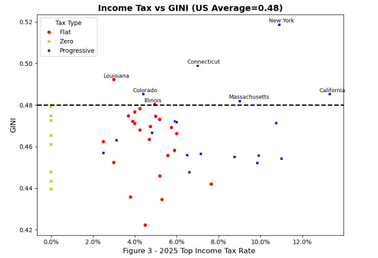 2025 Top Tax Rate Data and Tax Type (Zero, Flat, Progressive) was collected via individual internet searches and published polices from Intuit (makers of TurboTax, not a paid sponsor) and compared with 2024 published GINI Coefficients.