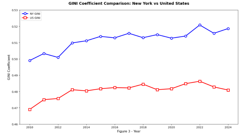 In a 2022 speech, Governor Kathy Hocul (D-NY) said, “Just jump on a bus and head down to Florida where you belong, ok? Get out of town, get out of town because you don’t represent our values, you are not New Yorkers” which at the time was met with cheers and standing ovation. Now, in 2026, Governor Hochul is saying “..cut me the checks if you want to be supportive but maybe the first step should be go down to Palm Beach and see who we can bring back home because our tax base has been eroded”. As discussed in part one, New York has been on a 50 year de-population trend that has spanned multiple administrations and under Governor Hochul’s time as governor and despite a tax base that is not growing proportionally to the rest of the country, income taxes collected have increased may times more than inflation and inequality has increased faster than the rest of the United States. New York is now ranked the 50th (the worst) state in the country for income inequality according to data from the official US GINI Coefficient data and the gap is getting wider over time while nationally, income inequality is decreasing. Is Progressive Tax Policy that bad? Do other states with Progressive Tax Policy fair better?