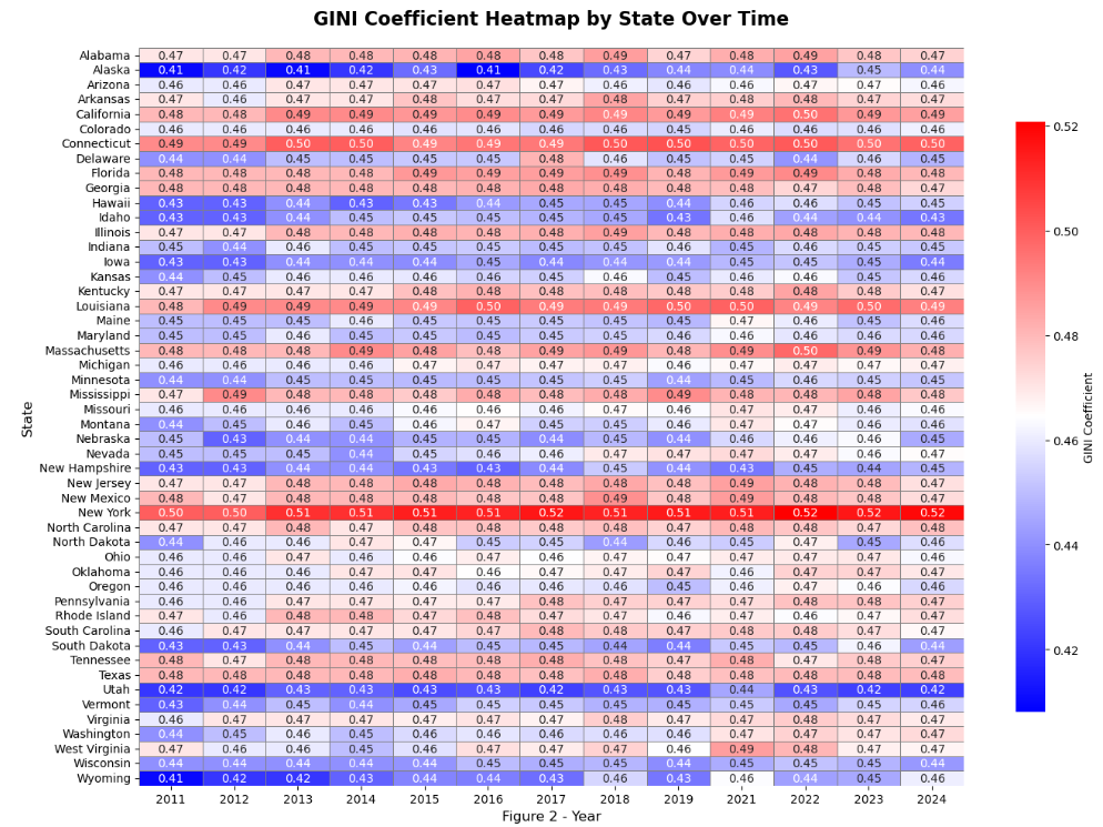 In a 2022 speech, Governor Kathy Hocul (D-NY) said, “Just jump on a bus and head down to Florida where you belong, ok? Get out of town, get out of town because you don’t represent our values, you are not New Yorkers” which at the time was met with cheers and standing ovation. Now, in 2026, Governor Hochul is saying “..cut me the checks if you want to be supportive but maybe the first step should be go down to Palm Beach and see who we can bring back home because our tax base has been eroded”. As discussed in part one, New York has been on a 50 year de-population trend that has spanned multiple administrations and under Governor Hochul’s time as governor and despite a tax base that is not growing proportionally to the rest of the country, income taxes collected have increased may times more than inflation and inequality has increased faster than the rest of the United States. New York is now ranked the 50th (the worst) state in the country for income inequality according to data from the official US GINI Coefficient data and the gap is getting wider over time while nationally, income inequality is decreasing. Is Progressive Tax Policy that bad? Do other states with Progressive Tax Policy fair better?