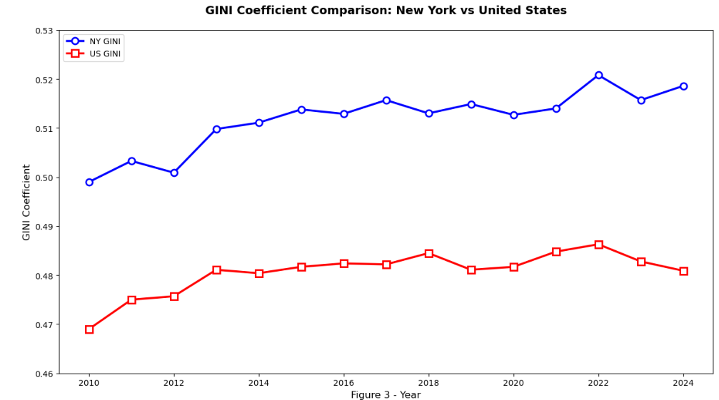 Figure 2 below is a secondary comparison using a Box and Whisker Plot with a line drawn at GINI = 0.48 to visualize where states with higher-than-average inequality are distributed. The medians of inequality in each group are also similar; however, there are more high-inequality (GINI >= 0.48) states in Progressive Tax States, in number, proportion, and depth of inequality. A one-tailed Z-test of the proportion of high-inequality states in Progressive Tax States (PProgressive= 27.78%) versus proportion of high-inequality states in Non-Progressive Tax States (PNonProgressive =6.25%) (Test 2) yielded a result of Z=-2.1058 (P-value: 0.0176) indicating there IS evidence of a higher proportion of high-inequality states in Progressive Tax States compared to Non-Progressive Tax States with New York being the highest inequality in the country as discussed in