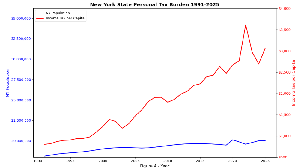 Sadly, states with Progressive Income Taxation are not fairing better than New York. There is evidence to disprove Progressive’s claim that Progressive Income Taxation reduces income inequality (measured by GINI). Across the United States, the distributions of income inequality in Zero Income Tax, Progressive Income Tax, and Flat Income Tax States are similar to each other (Figure 1) with no difference in the average inequality in the three groups (Test 1). There is evidence that Progressive Income Tax States have a higher proportion of high-inequality states (Test 2) and 5 of the 7 states with the highest total inequality (Figure 3). There is a positive correlation of Top Income Tax Rate with Inequality; however, there is no evidence of a statistical difference in the proportion of high-inequality states in high top tax rate states versus low top rate tax states (Test 3). This is one small view into a portion of the taxes paid by individuals and one economic metric. This doesn’t completely answer the question on if Progressive Income Taxes “work”; however, this is an indicator that states with Progressive Income Taxes have are more likely to have problems with inequality and do not perform as their proponents claim.
